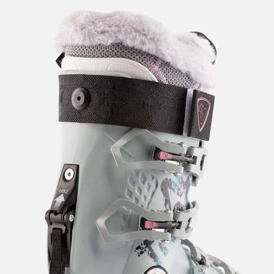 The lower boot shell is designed to offer a 50-degree range of motion in walk mode for efficient touring and maximum power for skiing when in ski mode